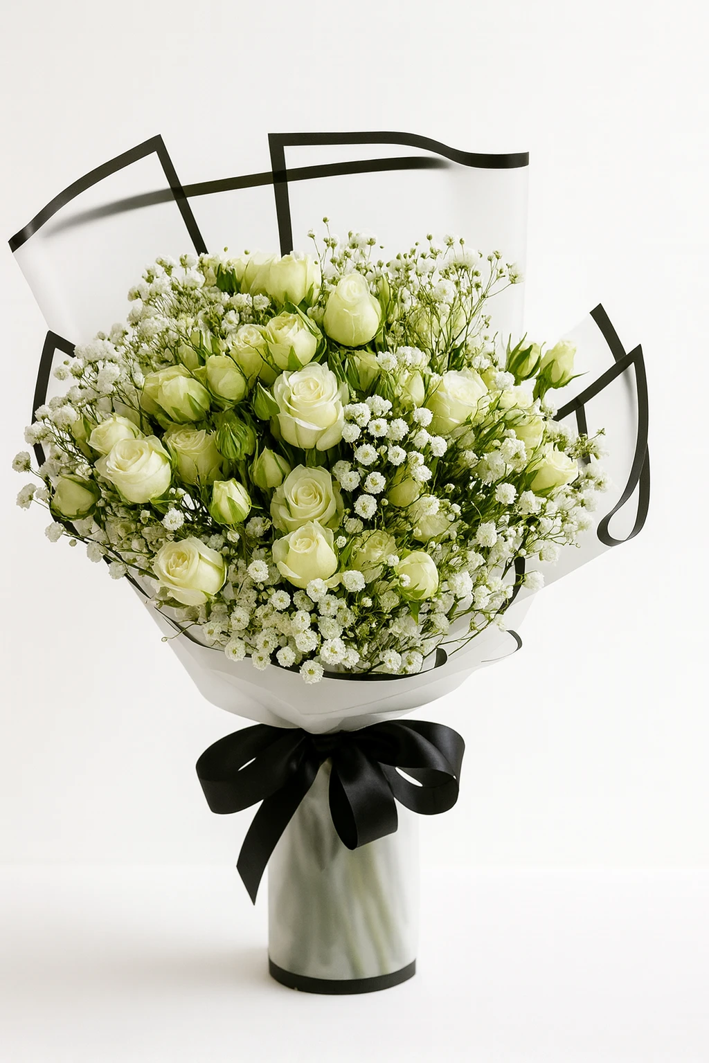 باقة يدوية مليئة بورد البيبي روز الابيض الطبيعي لمفاجئة الاحبة والاصدقاء.